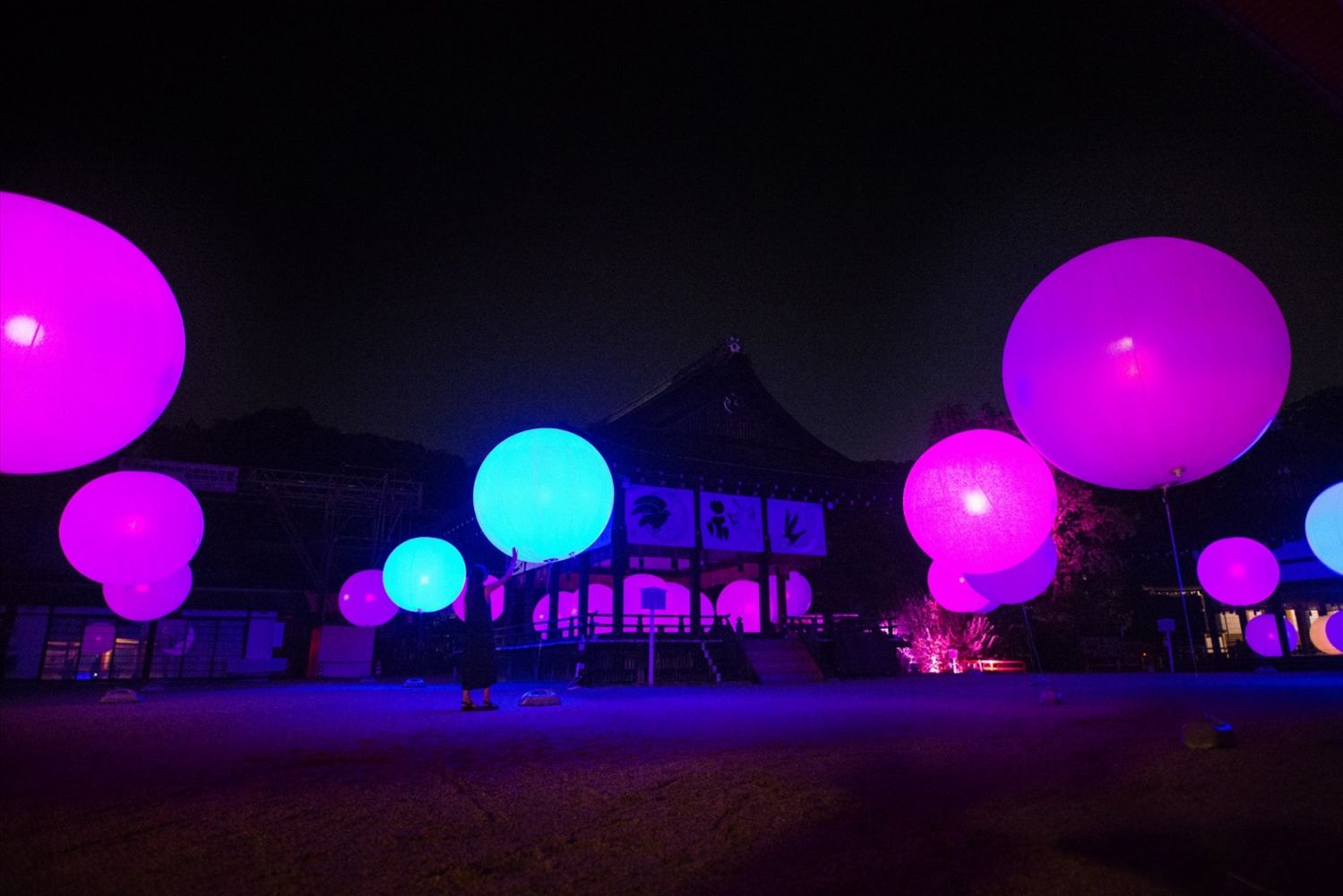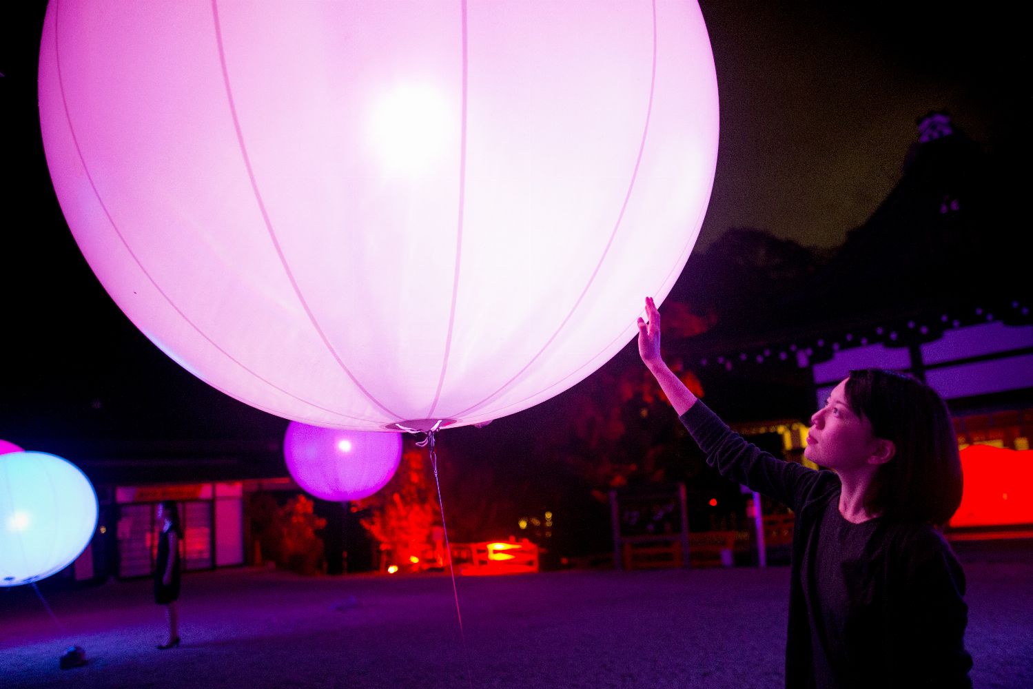 Teamlab describe the spheres of light floating in the space within the Sakura Gate as moving “on their own, shining brightly, then disappearing—as if they are softly breathing.”