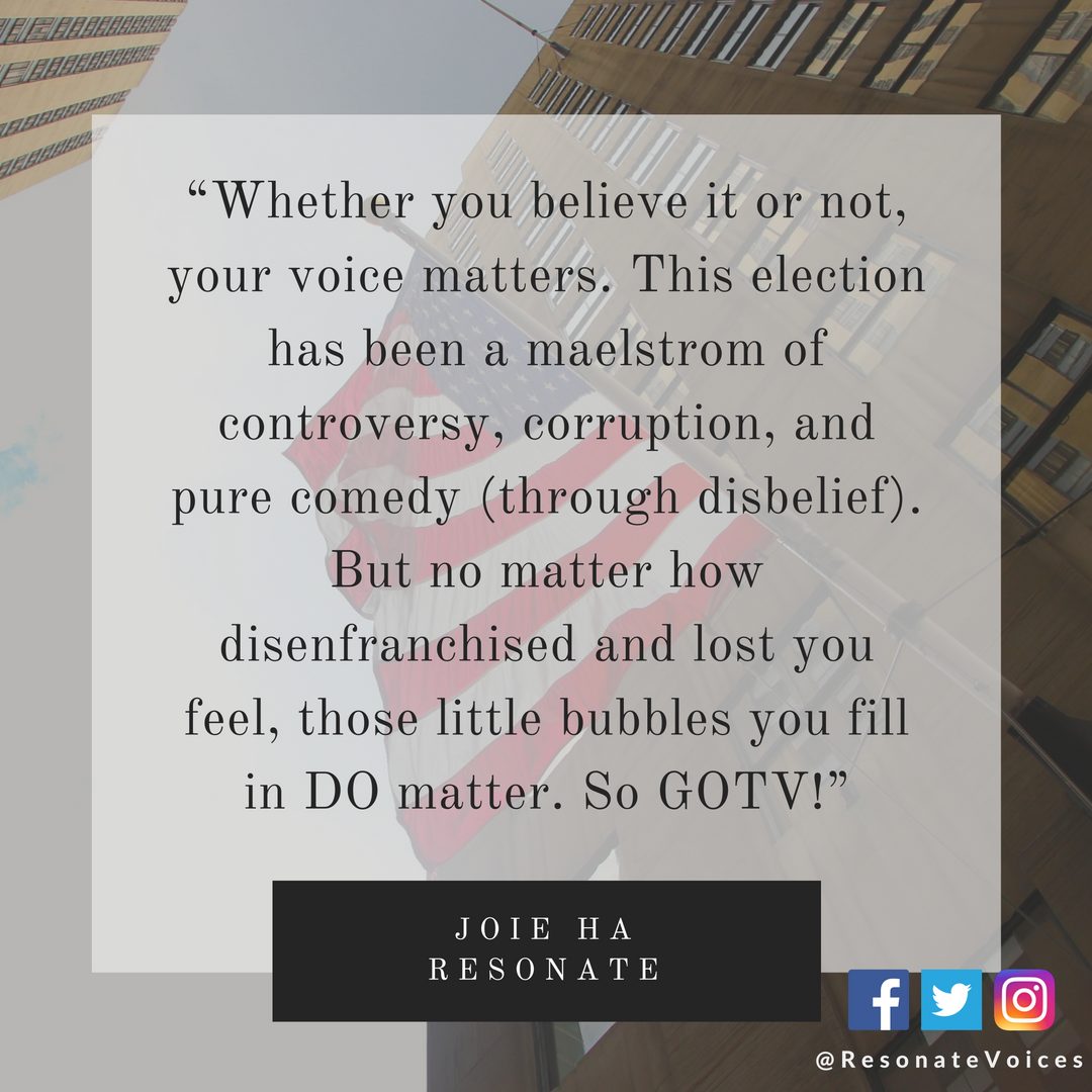 “Whether you believe it or not, your voice matters. This election has been a maelstrom of controversy, corruption, and pure comedy (through disbelief). But no matter how disenfranchised and lost you feel, those little bubbles you fill in DO matter. So GOTV!” – Joie Ha