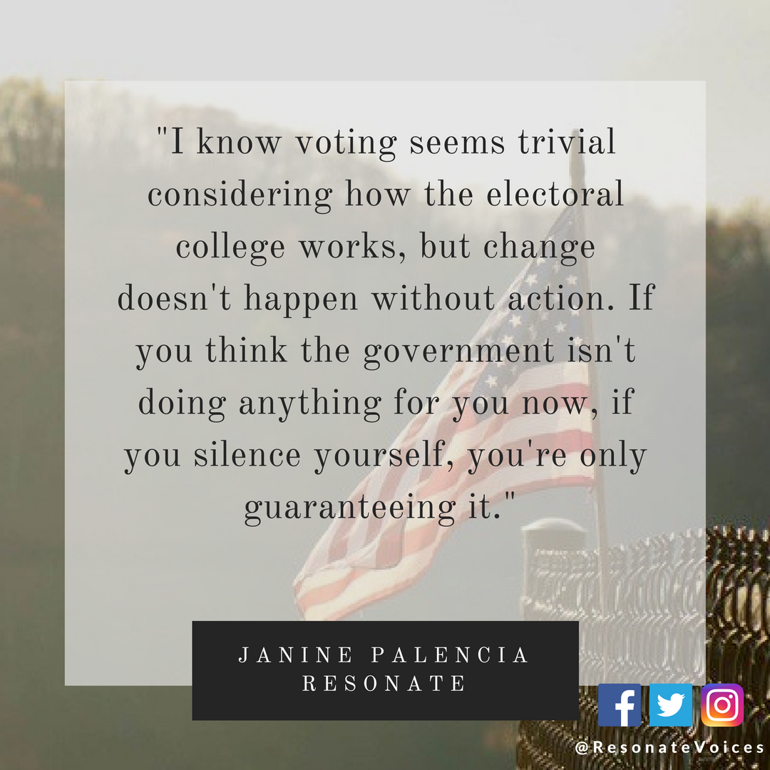 “I know voting seems trivial considering how the electoral college works, but change doesn’t happen without action. If you think the government isn’t doing anything for you now, if you silence yourself, you’re only guaranteeing it.” – Janine Palencia