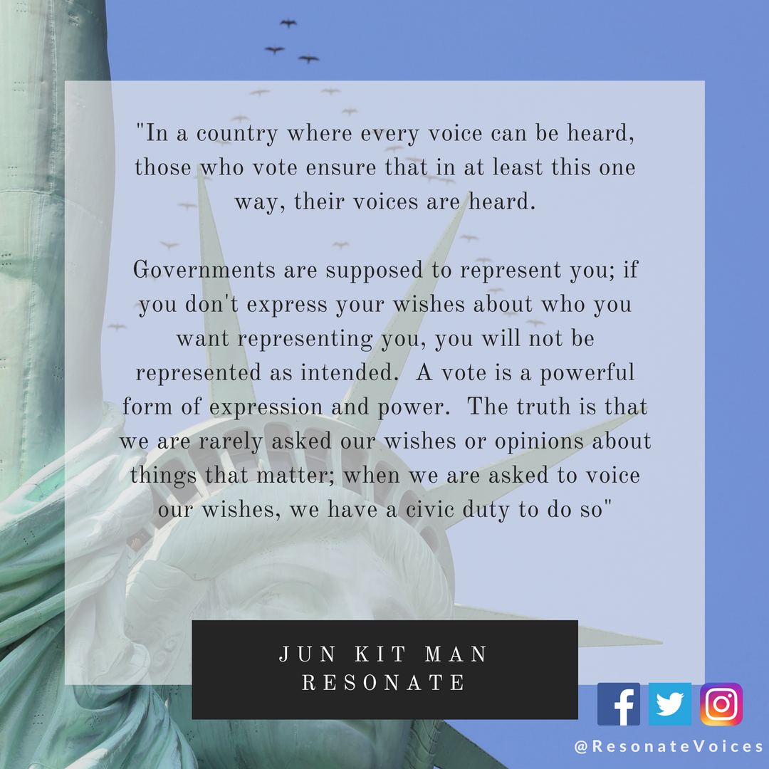 “In a country where every voice can be heard those who vote ensure that in at least this one way, their voices are heard. Governments are supposed to represent you; if you don’t express your wishes about who you want representing you, you will not be represented as intended. A vote is a powerful form of expression and powerful form of expression and power. The truth is that we are rarely asked our wishes or opinions about things that matter; when we are asked to voice our wishes, we have a civic duty to do so” – Jun Kit Man