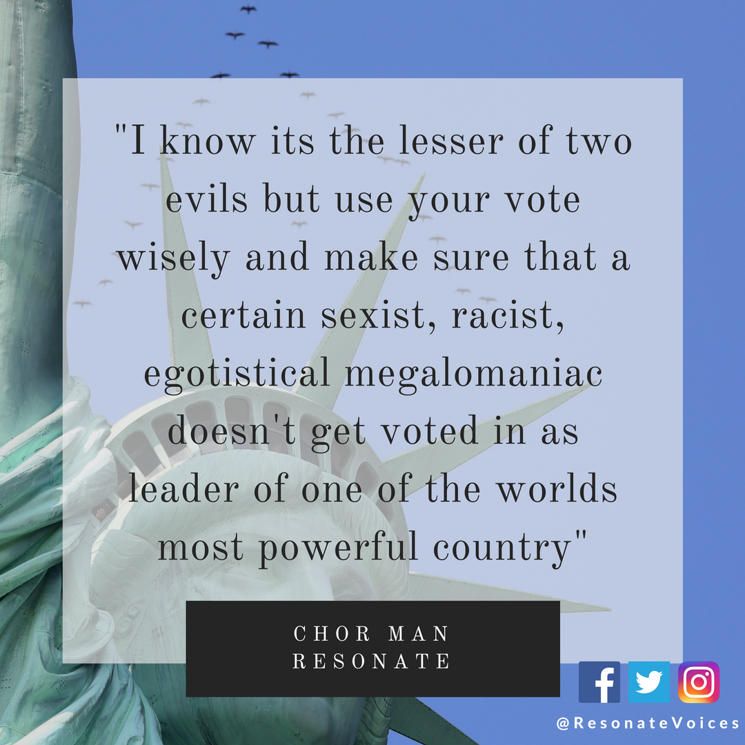 “I know it’s the lesser of two evils but use your vote wisely and make sure that a certain sexist, racist, egotistical megalomaniac doesn’t get voted in as leader of one of the worlds most powerful country” – Chor Man