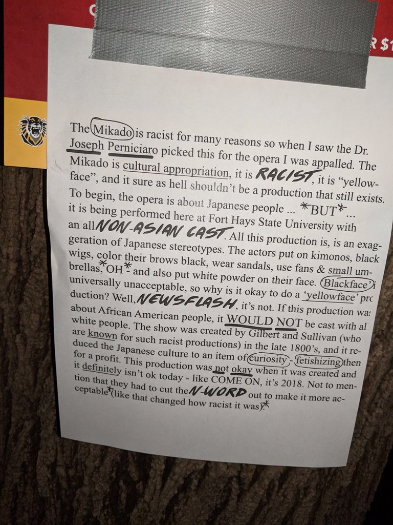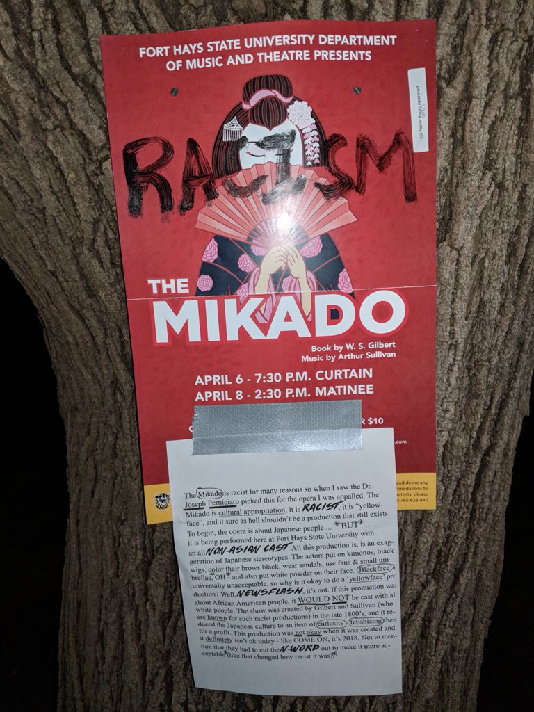 “The Mikado is cultural appropriation, it is RACIST, it is ‘yellow-face’, and it sure as hell shouldn’t be a production that exists,” the post reads. “The opera is about Japanese people… *BUT* … it is being performed here at Fort Hays State University with an all NON-ASIAN CAST.”