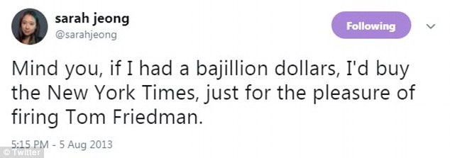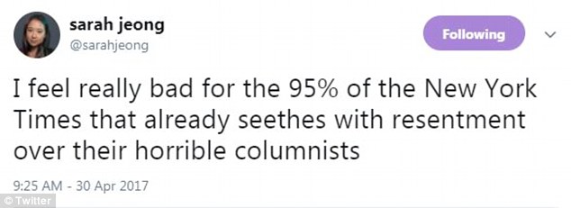 Some also pointed out that Jeong had slammed the New York Times in past tweets too. “I feel really bad for the 95% of the New York Times that already seethes with resentment over their horrible columnists,” she wrote.