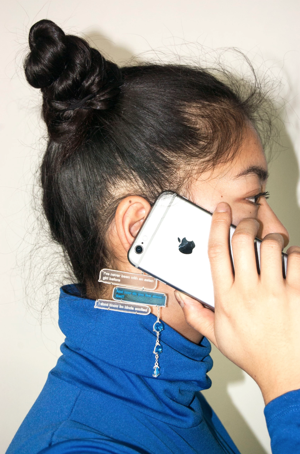 One set of earrings features a text conversation she had with men on the internet. Made from laser-cut acrylic, one earring shows the man’s speech bubble, in which he says he’s “never been with an asian girl before.” Another reads, “are you Asian or Chinese?” to which Chen replies, “Im chinese but chinese is a typa asian so.”