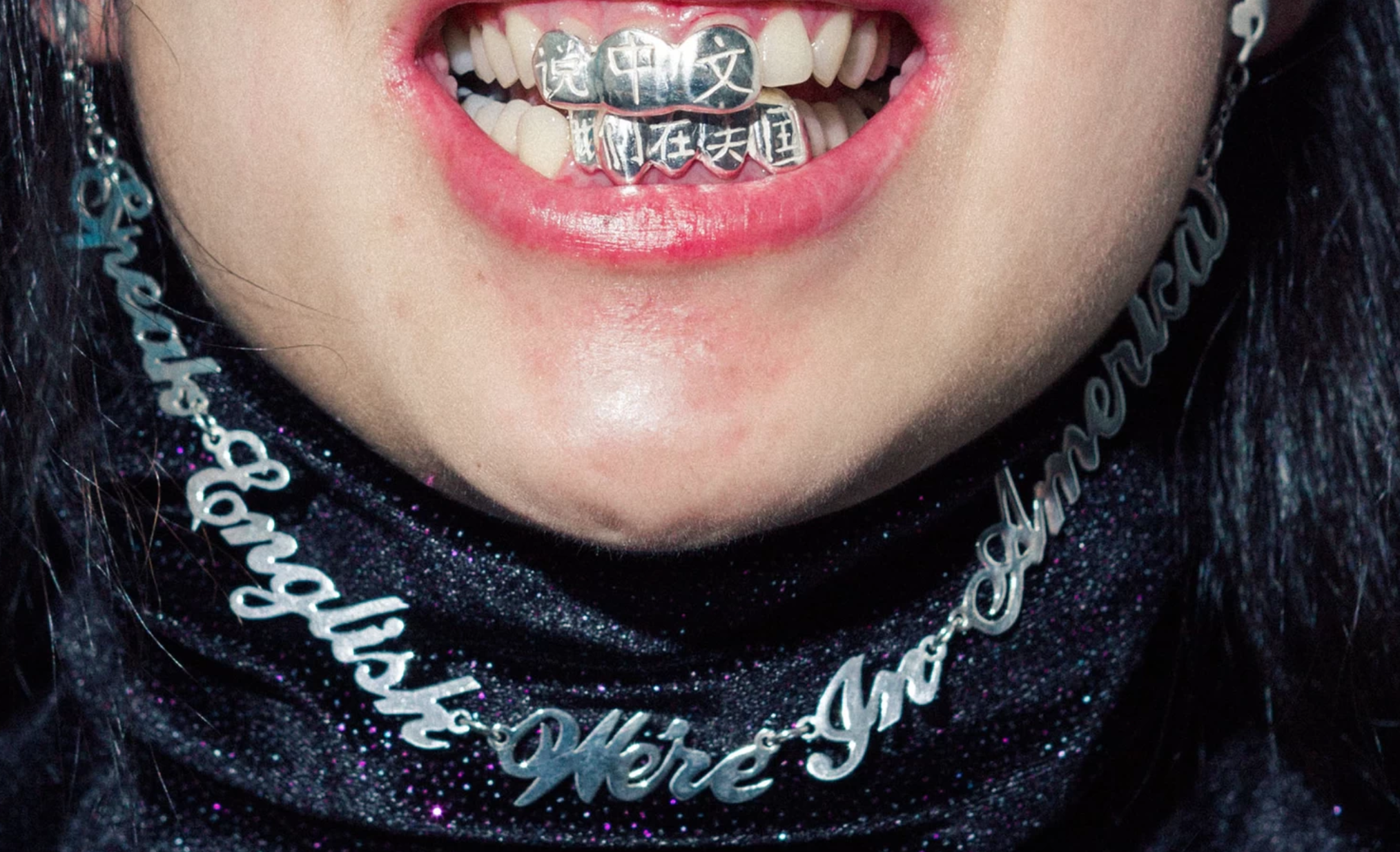 Another jewellery set features a silver teeth grill with Chinese engraving that translates to “speak Chinese, we’re in America.” The set also comes with a necklace that reads, “speak English, we’re in America.”