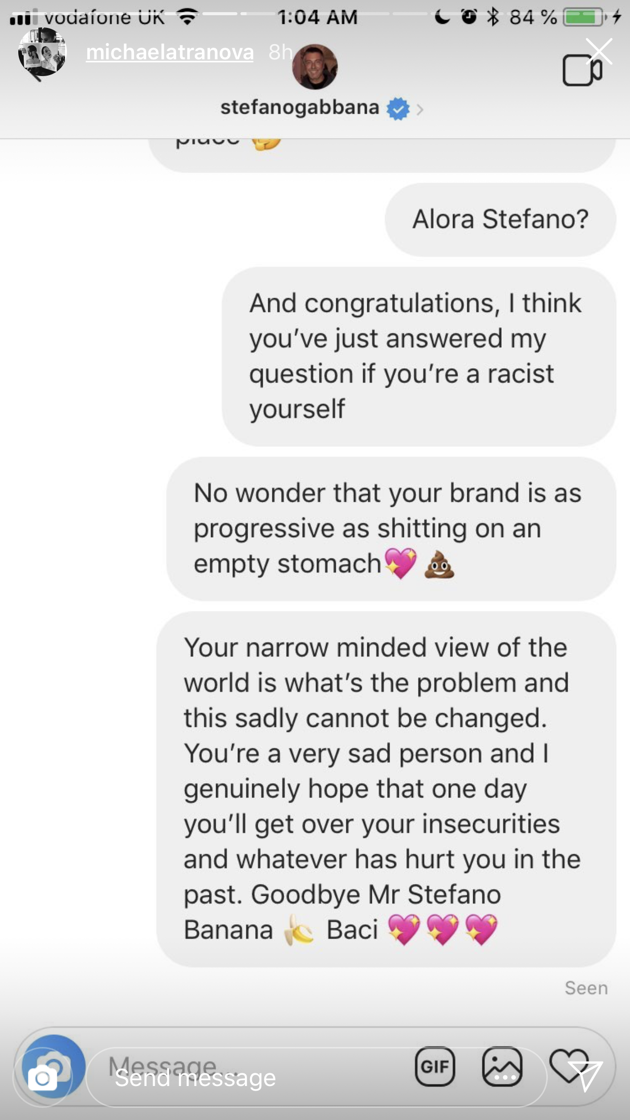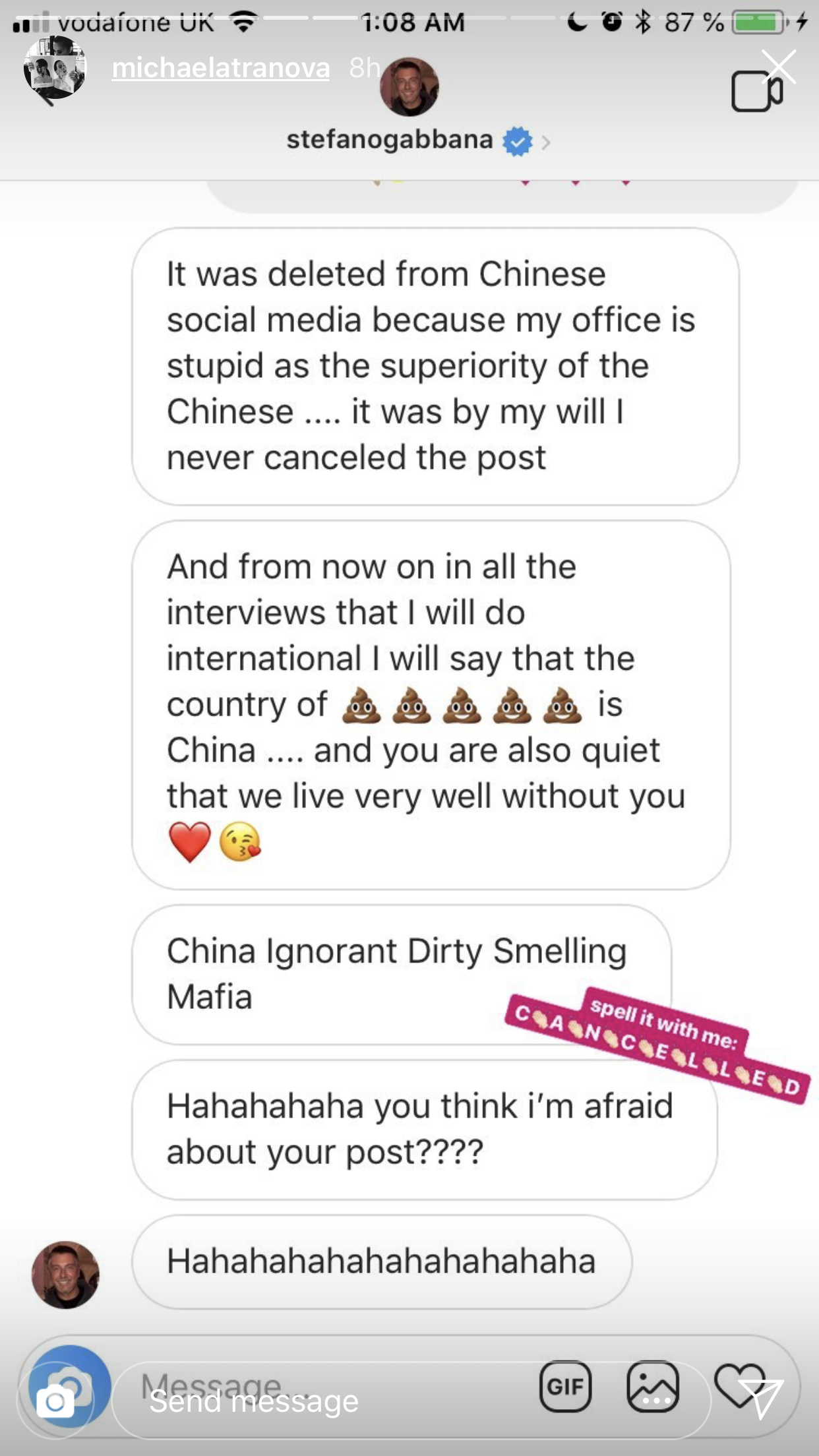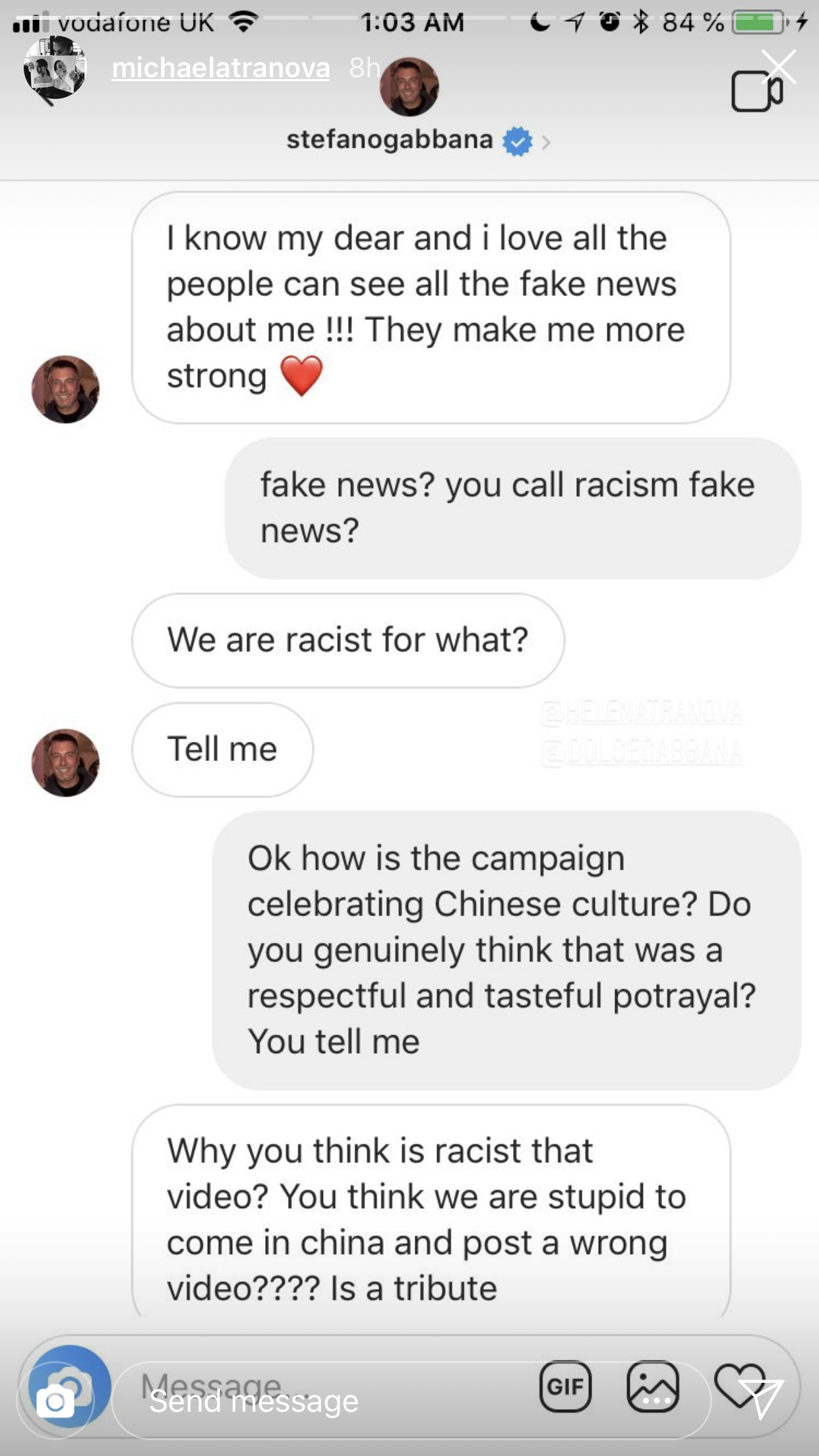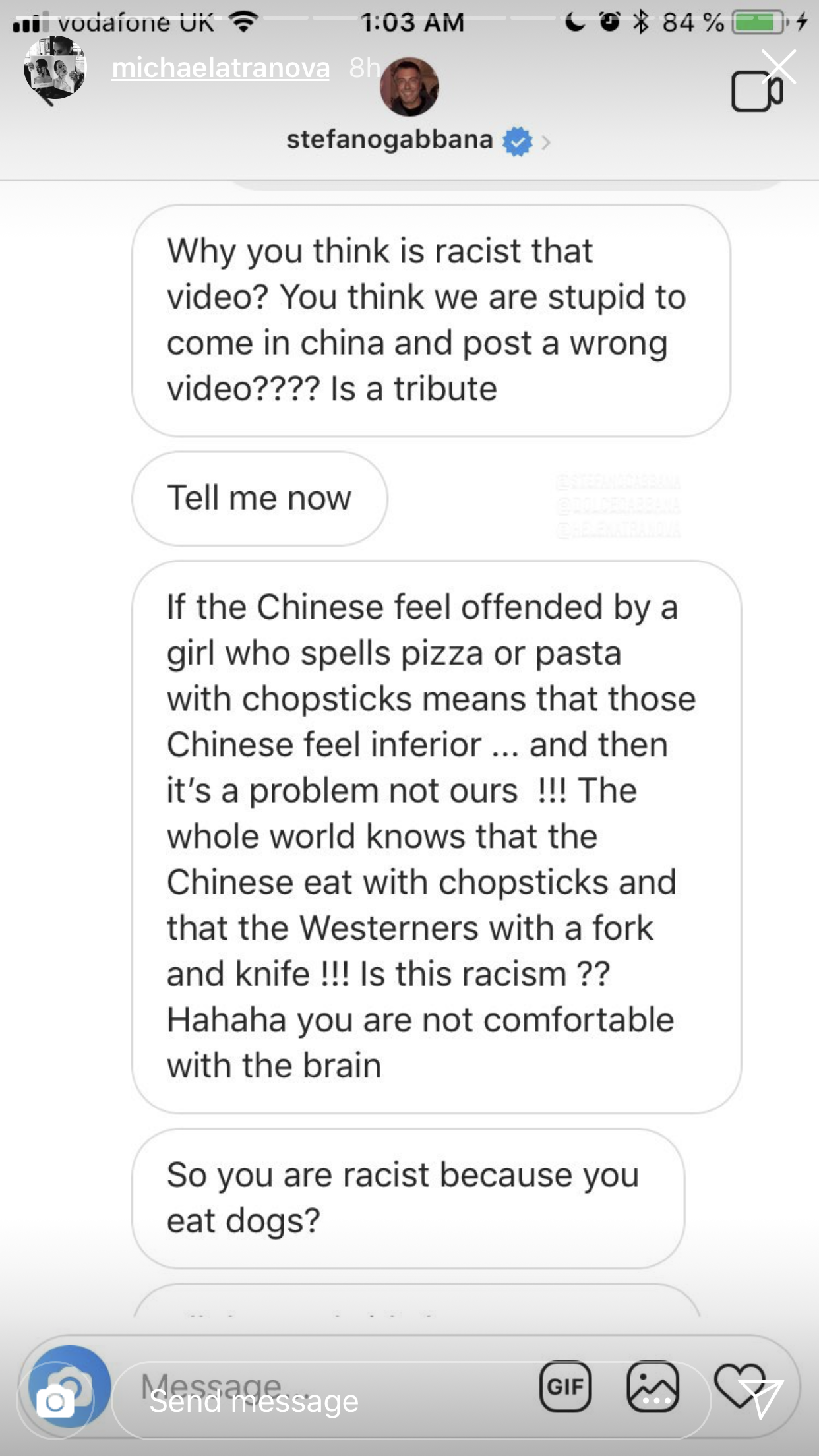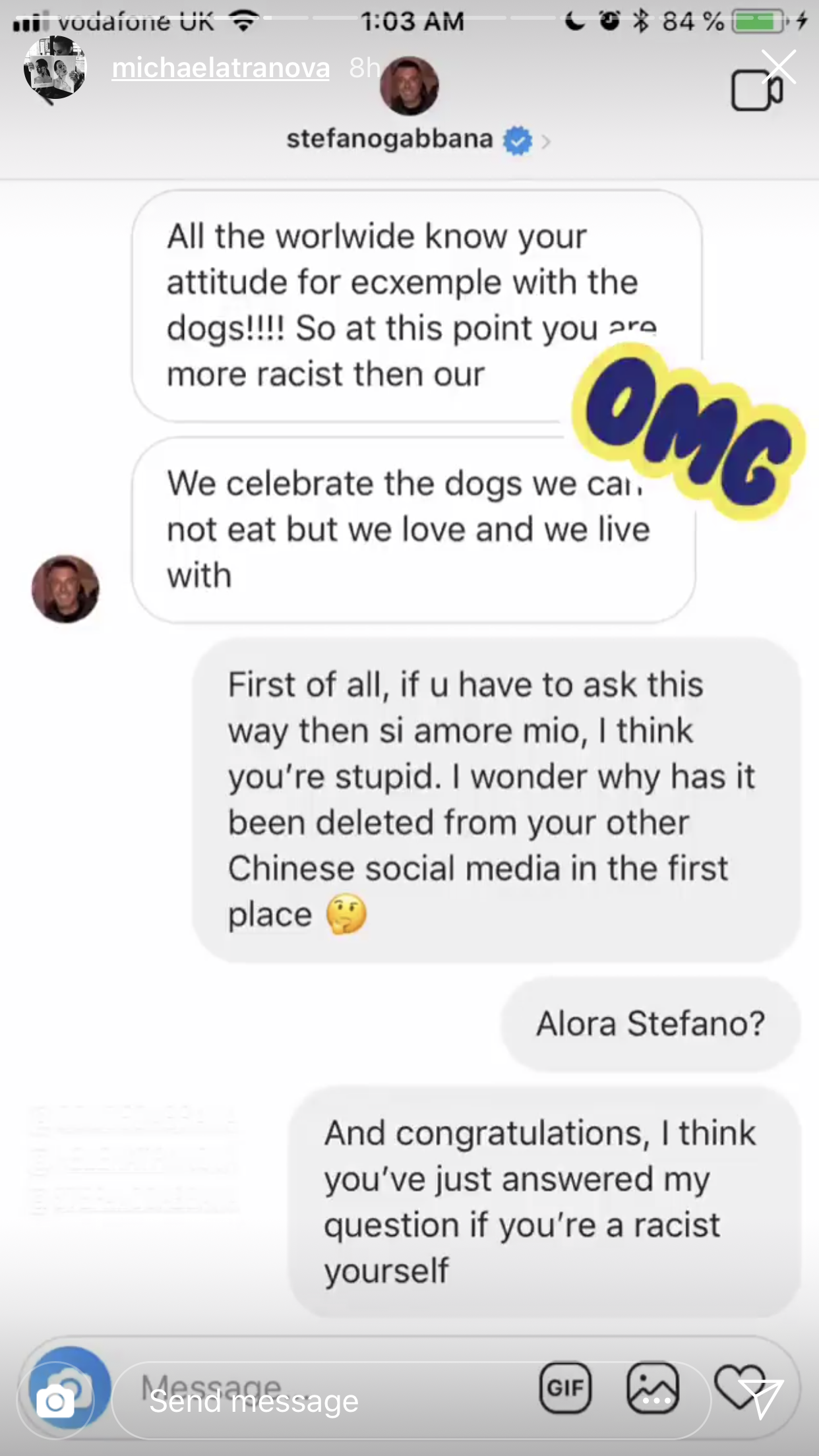 For some reason, Gabbana threw dog-eating into the conversation. “You are racist because you eat dogs?” He wrote.