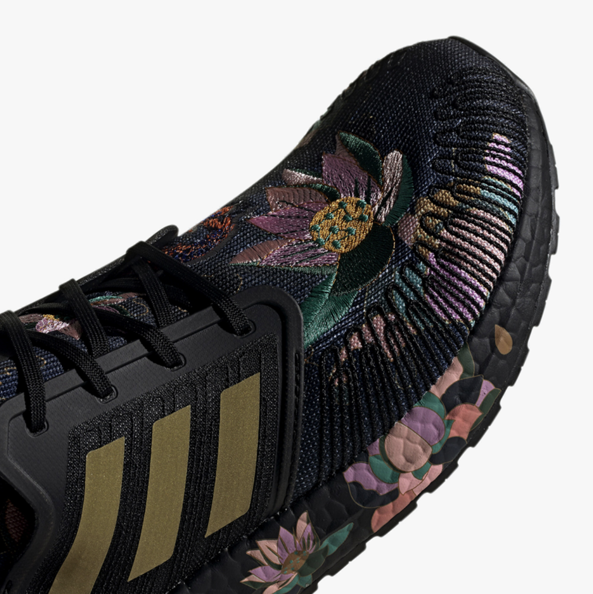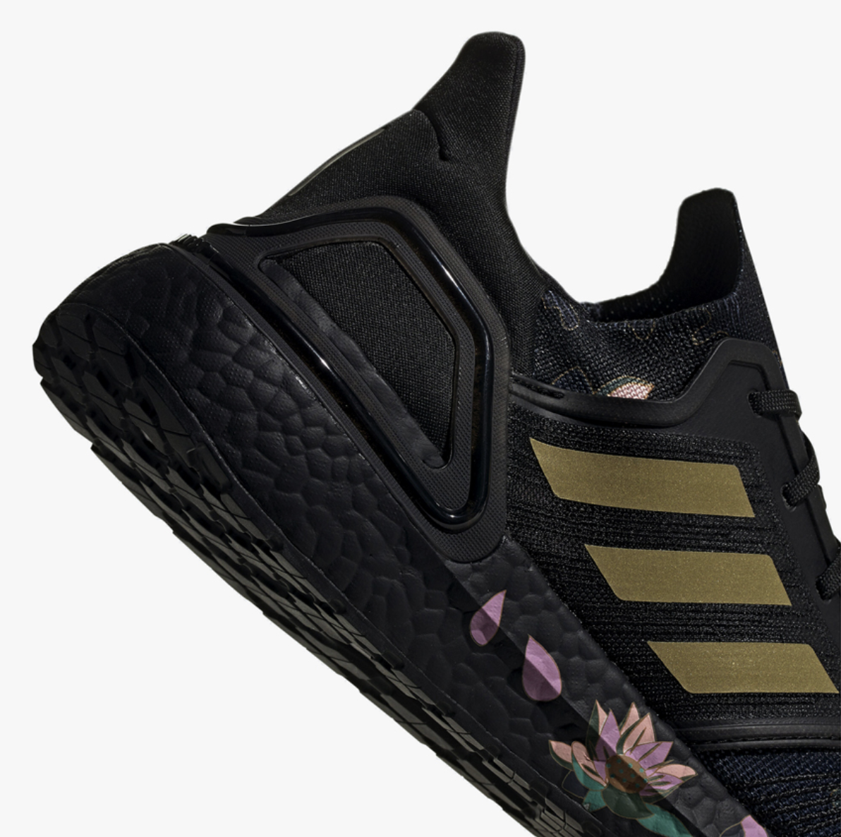The CNY shoe features a black midsole and Adidas’s three signature stripes in gold. Additionally, a lotus flower print inspired by Chinese cultural designs is printed across the shoe. Purple and pink flowers are embroidered on the tongue too.