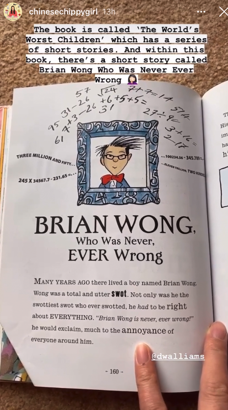 “Just going back to David Walliams’ ‘Brian Wong, who was never ever wrong’, no David Walliams, you’ve got it wrong!” The Instagrammer says.