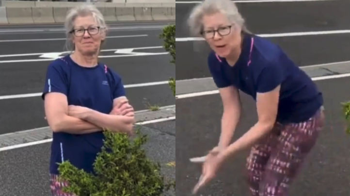 In the video, the woman is heard saying “have you never heard of a leash in the city?” to an Asian man filming behind the camera.