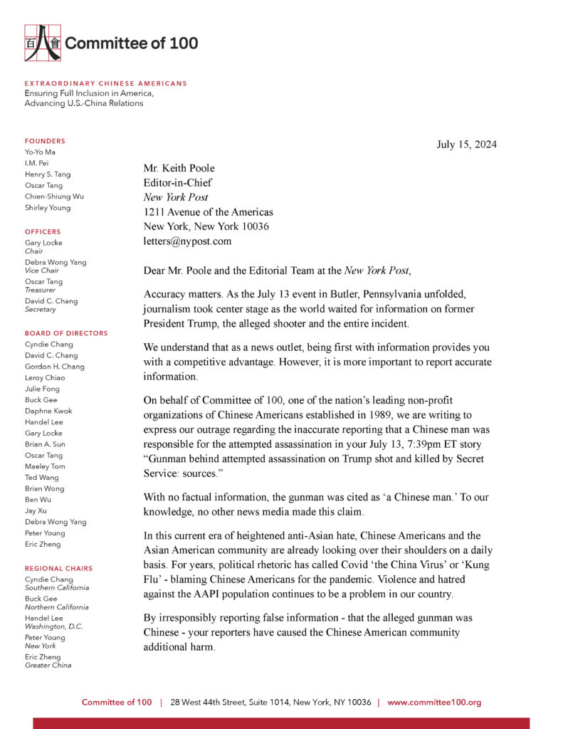 Cindy Tsai, Interim President, Committee of 100, also stated, “In this 24/7 news cycle we live in, accuracy matters just as much as the words being used. By incorrectly reporting a criminal suspect by a specific race or ethnicity – without the facts to back it up – that creates untold harm to that entire community. In this case with the inaccurate reporting from New York Post, the Chinese American community has once again been victimized.”