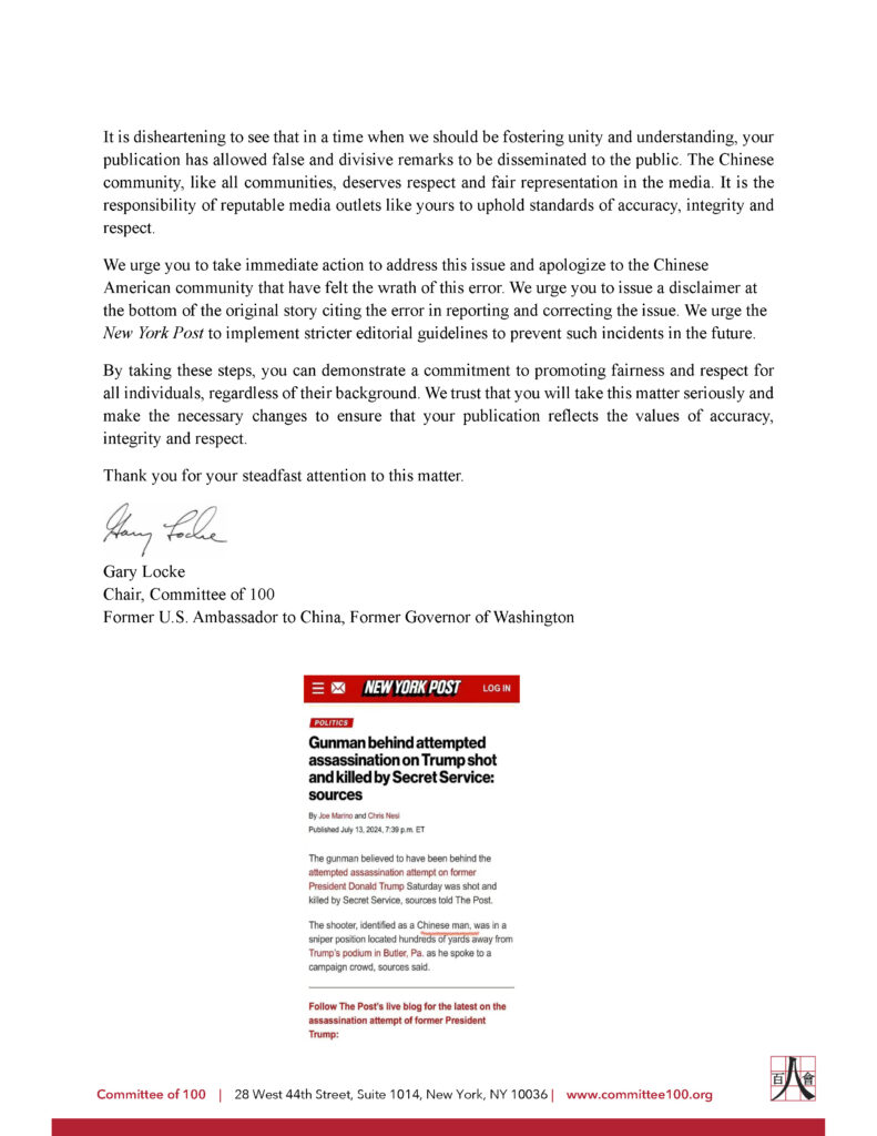 Committee of 100 have additionally sent a letter directly to the New York Post’s Editor in Chief, Keith Poole, demanding an apology.