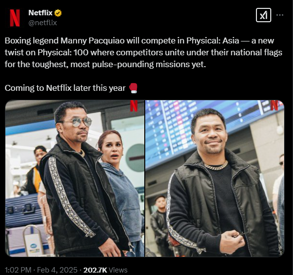 The show will premiere in the fourth quarter of 2025, following the success of its predecessor, which became the first Korean reality series to top the Non-English TV Series list on Netflix. With the star power of Pacquiao and other competitors yet to be announced, Physical: Asia is already generating buzz, even before its official release.