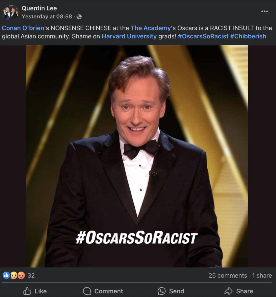 Others were less supportive of O’Brien’s attempt. “Conan O’brien’s NONSENSE CHINESE at the The Academy’s Oscars is a RACIST INSULT to the global Asian community. Shame on Harvard University grads! #OscarsSoRacist #Chibberish,” wrote Quentin Lee on Facebook.