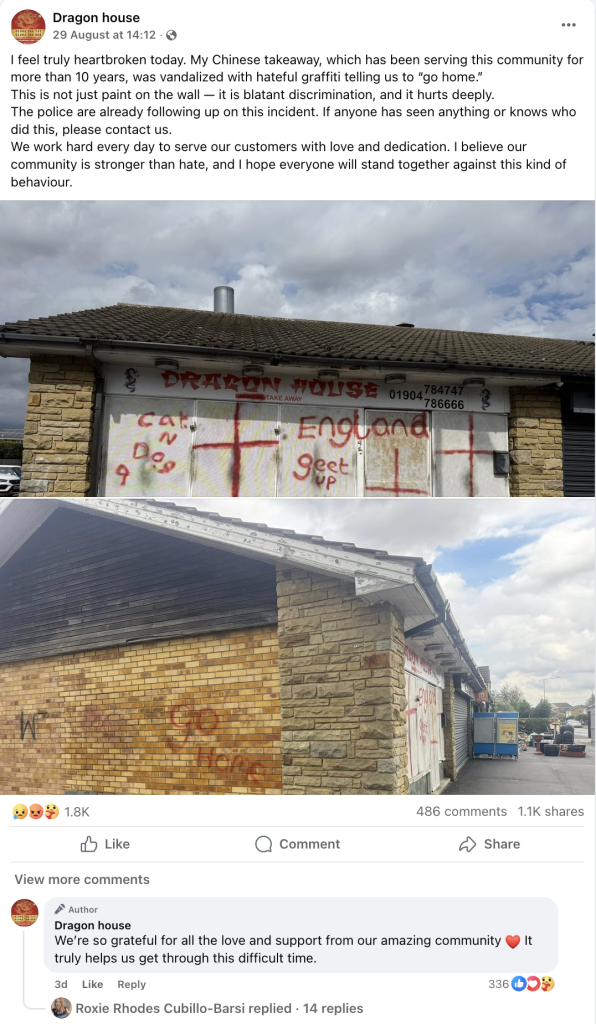 The heartbroken owners of a Chinese takeaway in York have been left devastated after their business was targeted with racist graffiti. The vile messages, which included the words “go home” and a version of the St George’s Cross, were discovered on the front of Dragon House on Foxwood Lane on Friday morning.
