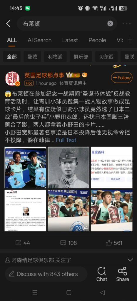 Brighton & Hove Albion has issued an apology to fans in China after a social media post from the club’s academy ignited backlash for featuring an image of Japanese World War II soldier Hiroo Onoda. The post, which showed Japan international Kaoru Mitoma and a youth player posing with football cards depicting Onoda, triggered immediate anger on Chinese platforms, particularly Weibo, where users criticised the club for insensitivity toward Japan’s wartime history in the region.