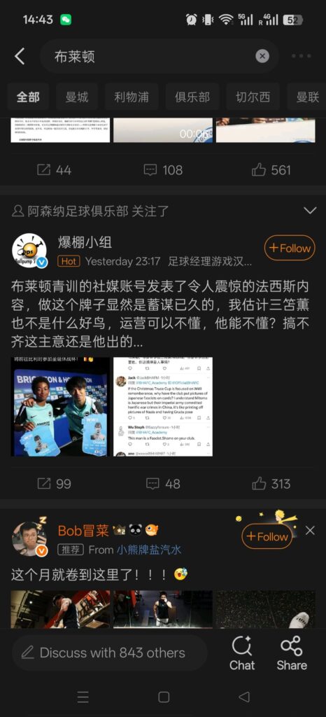 One Weibo user wrote, “Fascist club, you must sincerely apologize and explain to the Asian people.” Another demanded disciplinary action against the player, saying, “Militarist Kaoru Mitoma must be expelled.” Some commenters escalated the rhetoric further, calling Mitoma a “militarist” and a “Nazi clown.”