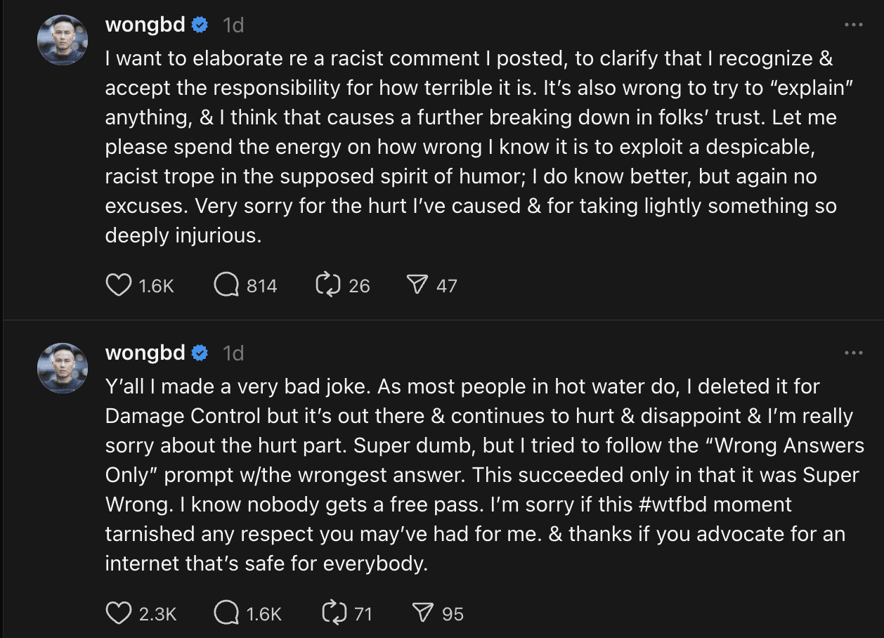 Hours later, Wong expanded on his apology, acknowledging the harm caused. “I want to elaborate on a racist comment I posted, to clarify that I recognize & accept the responsibility for how terrible it is. It’s also wrong to try to ‘explain’ anything, & I think that causes a further breaking down in folks’ trust.”