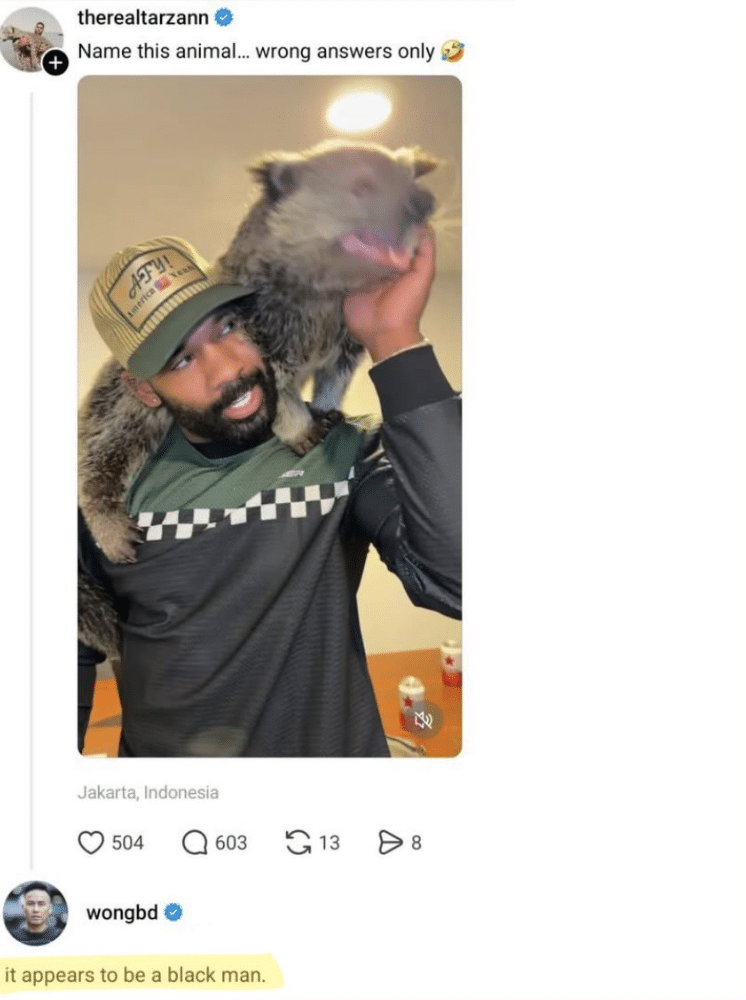 The Law & Order and Jurassic World actor found himself under fire after responding to a post by animal educator and influencer Mike Holston (@TheRealTarzan), who has more than 16 million Instagram followers. Holston had shared a photo with an animal alongside the caption: “Name this animal…wrong answers only.” Wong allegedly replied in a since-deleted comment: “It appears to be a Black man.”