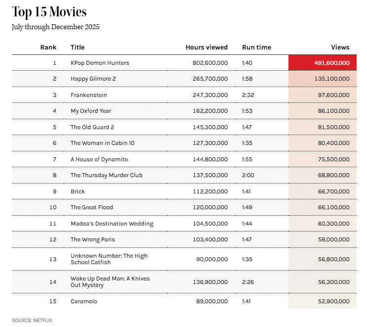 In the second half of 2025, KPop Demon Hunters rewrote Netflix’s record books. The animated film amassed 481.6 million views worldwide between July and December, making it the most-watched title — film or series — in any six-month period in the platform’s history.